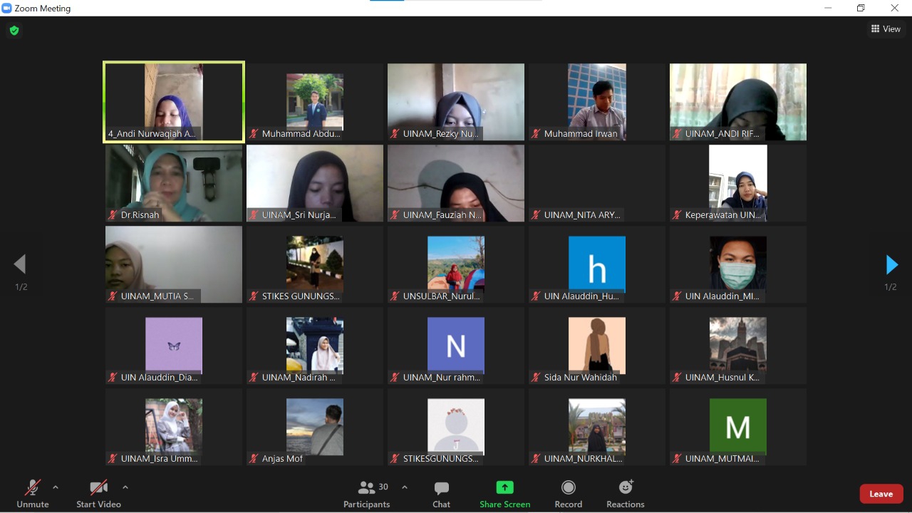 Mahasiswa jurusan keperawatan Fakultas Kedokteran dan Ilmu Kesehatan yang menjadi panitia dan Moderator dipandu langsung oleh salah seorang dosen mereka yakni Syamsiah Rauf S.Kep.,Ns.,M.Kep. Acara berlangsung secara online dengan aplikasi zoom dan menghadirkan peserta mahasiswa, Dosen dan praktisi dari berbagai instansi yang tercatat oleh panitia asal institusi peserta dalam kegiatan ini yakni dari RSU.Labuang Baji Makassar, RS.Maryam Citra Medika Makassar, Akper YPP Majene, STIKES Gunung Sari Makassar, STIK Famika Makassar, Universitas Sulawesi Barat dan Universitas Islam Negeri Alauddin Makassar (*)