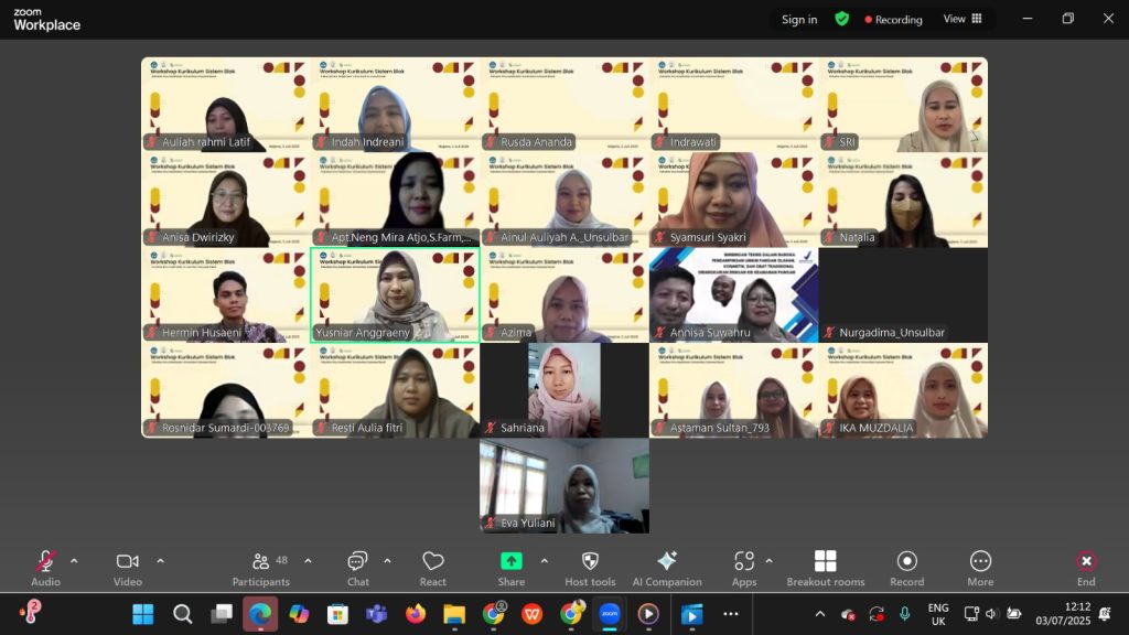 Majene, 3 Juli 2025 – Fakultas Ilmu Kesehatan (FIKES) Universitas Sulawesi Barat (Unsulbar) menyelenggarakan kegiatan Workshop Kurikulum Sistem Blok secara daring melalui platform Zoom Meeting. Kegiatan ini merupakan upaya untuk meningkatkan kualitas pendidikan melalui pengembangan kurikulum yang lebih terstruktur, integratif, dan relevan dengan kebutuhan zaman.