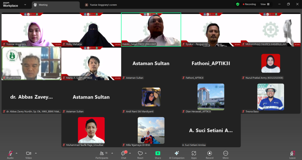 Program Studi D4 Keselamatan dan Kesehatan Kerja (K3) Fakultas Ilmu Kesehatan Universitas Sulawesi Barat menggelar Lokakarya Kurikulum secara daring melalui Zoom Meeting. Kegiatan ini dibuka secara resmi oleh Dekan FIKES, Dr. Habibi, SKM., M.Kes, dan menghadirkan berbagai pemangku kepentingan dari asosiasi profesi, dunia industri, pelayanan kesehatan, hingga institusi pendidikan.
