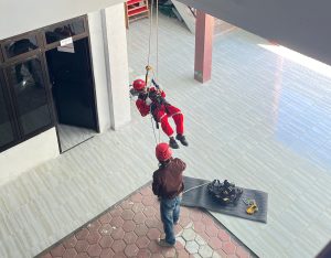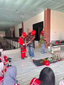 Setelah sesi pengenalan, mahasiswa mempraktikkan langsung teknik pembuatan simpul tali. Selanjutnya, peserta melakukan praktik ascending (naik) dan descending (turun) dari lantai 1 ke lantai 2 gedung kampus. Kegiatan inti ditutup dengan simulasi teknis rescue di ketinggian, yang menjadi salah satu kompetensi krusial dalam penanganan darurat di area kerja vertikal dan ruang terbatas.