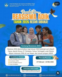 Kementerian Pendidikan Tinggi, Sains, dan Teknologi Republik Indonesia melalui Pusat Pembiayaan dan Asesmen Pendidikan Tinggi resmi membuka Pendaftaran Beasiswa ADik Tahun 2026. Program ini merupakan bentuk komitmen pemerintah dalam memperluas akses pendidikan tinggi yang inklusif dan merata bagi seluruh anak bangsa, khususnya dari wilayah yang membutuhkan perhatian khusus.