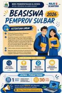 Pemerintah Provinsi Sulawesi Barat melalui Biro Pemerintahan dan Kesejahteraan Rakyat kembali membuka kesempatan emas bagi putra-putri daerah melalui program Beasiswa Pemprov Sulbar Tahun 2026. Program ini hadir sebagai bentuk komitmen pemerintah dalam meningkatkan kualitas sumber daya manusia yang unggul, berdaya saing, dan berkontribusi bagi pembangunan daerah.